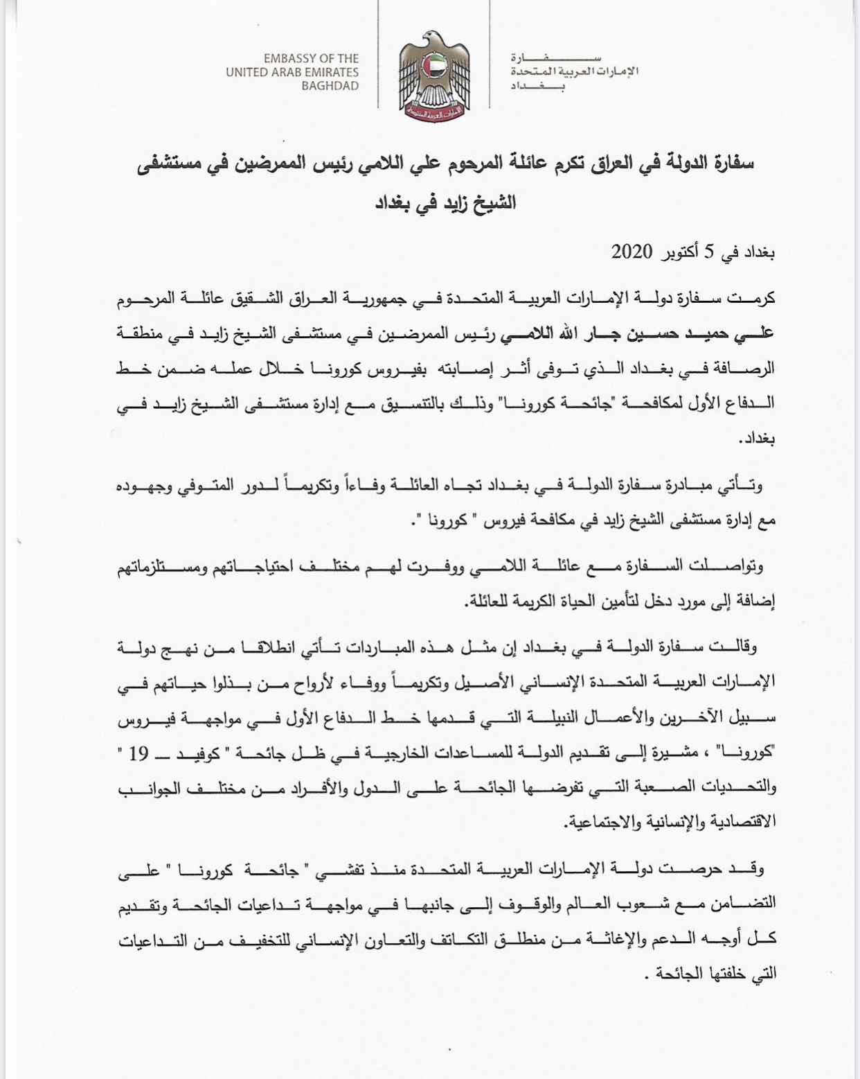 دولة الامارات العربية تكرم عائلة كبير ممرضي مستشفى الشيخ زايد بعد وفاته