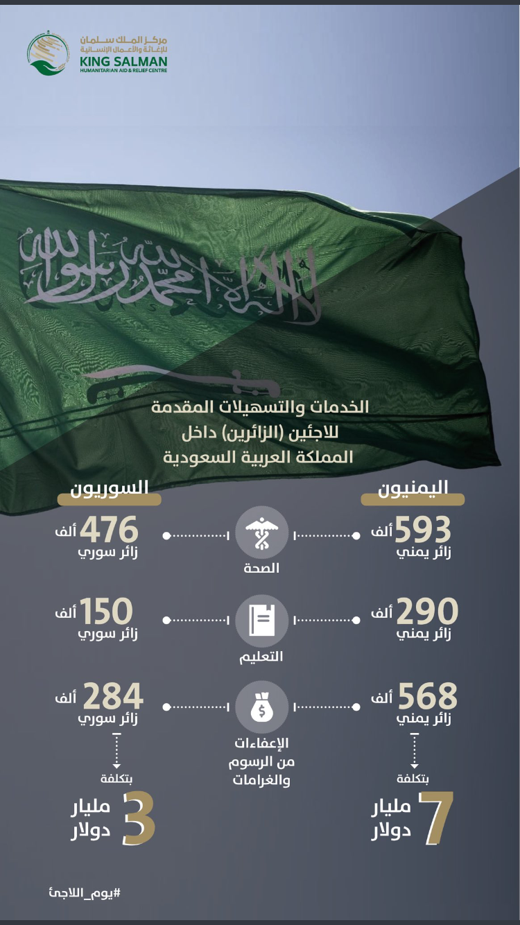 تحتضن المملكة العربية #السعودية على أراضيها أكثر من مليون زائر (لاجئ) من الأشقاء اليمنيين والسوريين والمينماريين مقدّمةً لهم كافة التسهيلات الممكنة لعيش حياة كريمة، تقديرًا لأوضاعهم وتخفيفًا من معاناتهم