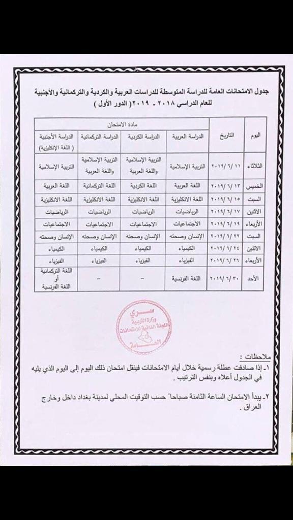 اعلنت وزارة التربية / المديرية العامة للتقويم والامتحانات تغيير موعد الامتحانات العامة للدراسة المتوسطة للعام الدراسي 2018-2019 . وقال مدير العلاقات العامة والاعلام في الوزارة السيد فراس محمد حسن ان الامتحانات ستبدأ يوم الثلاثاء الموافق 2019/6/11 وتنتهي يوم الاحد الموافق 2019/6/30 . واضاف حسن ان الوزارة ابلغت المديريات العامة للتربية في بغداد والمحافظات كافة عدا اقليم كردستان بالموعد الجديد …