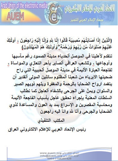 أكمل القراءة »الاتحاد العربي للإعلام الإلكتروني يعزي أهل الموصل