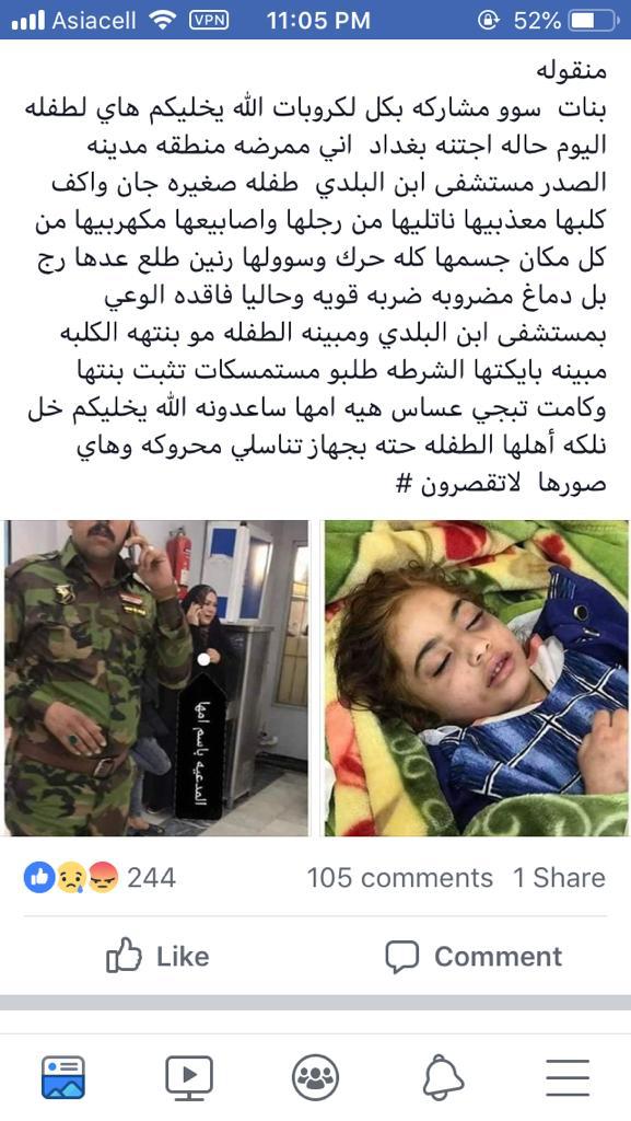 زار وزير الصحة والبيئة علاء الدين العلوان الطفلة رهف في مستشفى الشهيد الصدر ببغداد والتي احيلت من مستشفى ابن البلدي وهي تعاني من إصابات وكدمات شديدة واستطاعت ملاكاتنا الطبية والصحية بعد ان بذلت قصاري الجهود لإسعاف الحالة وتقديم جميع الاجراءات الصحية اللازمة وحاليا ترقد في العناية المركزة وحالتها الصحية حرجة. وأكد الوزير على تسخير كافة جهود الوزارة لتقديم اللازم لها …