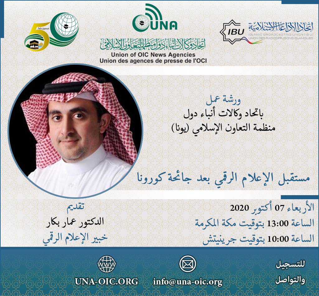 جدة 21 أغسطس 2020 ينظم اتحاد وكالات أنباء دول منظمة التعاون الإسلامي (يونا) في السابع من أكتوبر المقبل، ورشة عمل افتراضية عبر برنامج ZOOM بعنوان: “مستقبل الإعلام الرقمي بعد جائحة كورونا” لفائدة منسوبي وكالات الأنباء الأعضاء ومنسوبي الهيئات الإذاعية والتليفزيونية والإعلاميين بالصحف والمنصات الإلكترونية بالعالم الإسلامي، وذلك بالشراكة مع كل من إدارة الإعلام بمنظمة التعاون الإسلامي واتحاد الإذاعات الإسلامية “إيبو”. …
